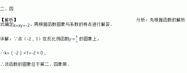 若点(-2,1)在反比例函数y=的图象上,则该函数的图象位于第________象限.
