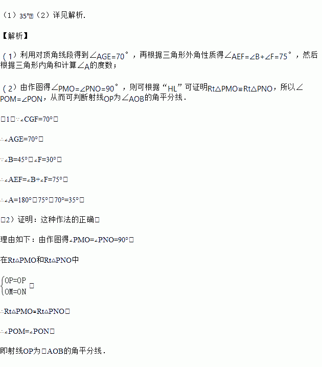 (2)利用三角板也能画出一个角的平分线,画法如下:①利用三角板在∠AOB的两边上分