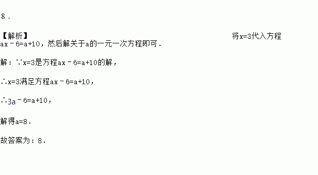 . 【解析】将x=3代入方程ax﹣6=a+10,然后解关于a的一元一次方程即可. 【解析】 ∵x=3是方程ax﹣6=a+10的解, ∴x=3满足方程ax﹣6=a+10, ∴3a﹣6=a+10, 解得a=8. 故答案为:8.