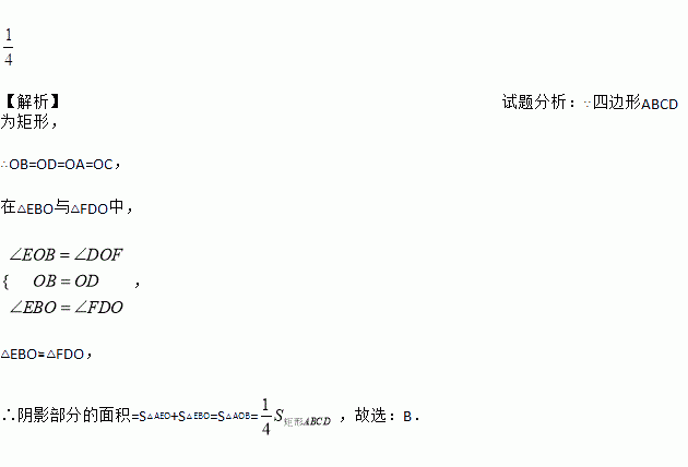 如图,EF过矩形ABCD对角线的交点O,且分别交AB、CD于E、F,那么阴影部分的面积是矩形ABCD的面积的_______.