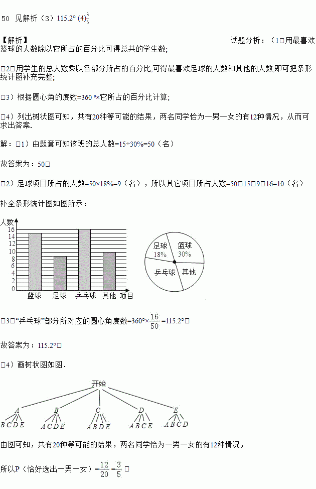 (4)学校将举办体育节,该班将推选5位同学参加乒乓球活动,有3位男同学(A,B,C)和2位女同学(D,E),现准备从中选取两名同学组成双打组合,用树状图或列表法求恰好选出一男一女组成混合双打组合的概率.