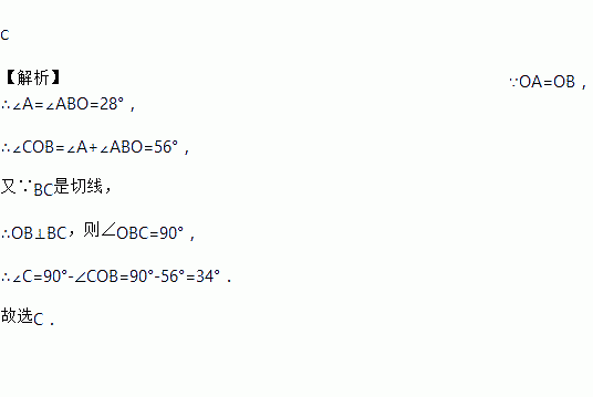 如图,AB是⊙O的弦,AO的延长线交过点B的⊙O的切线于点C,如果∠ABO=28°,则∠C的度数是( )