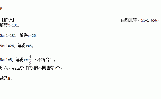 小颖按如图所示的程序输入一个正整数x,输出结果为656,则满足条件的x的值最多有( )