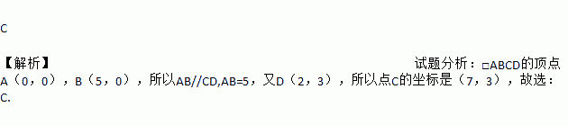 C 【解析】试题分析:□ABCD的顶点A(0,0),B(5,0),所以AB//CD,AB=5,又D(2,3),所以点C的坐标是(7,3),故选:C.
