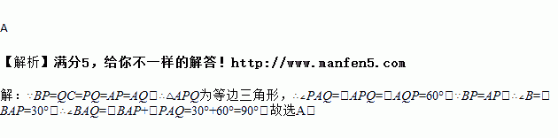 已知:如图,P、Q是△ABC的边BC上的两点,,并且PB=PQ=QC=AP=AQ.则∠BAQ=( )