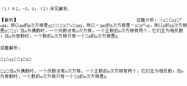 (1)64的6次方根是 ,-243的5次方根是 ,0的10次方根是 ;