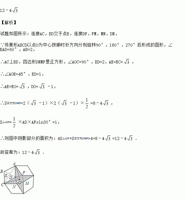 如图,是将菱形ABCD以点O为中心按顺时针方向分别旋转90°,180°,270°后形成的图形.若∠BAD=60°,AB=2,则图中阴影部分的面积为 .