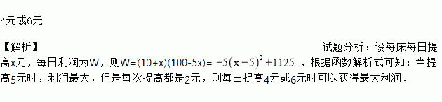 4元或6元 【解析】试题分析:设每床每日提高x元,每日利润为W,则W=(10+x)(100-5x)= ,根据函数解析式可知:当提高5元时,利润最大,但是每次提高都是2元,则每日提高4元或6元时可以获得最大利润.