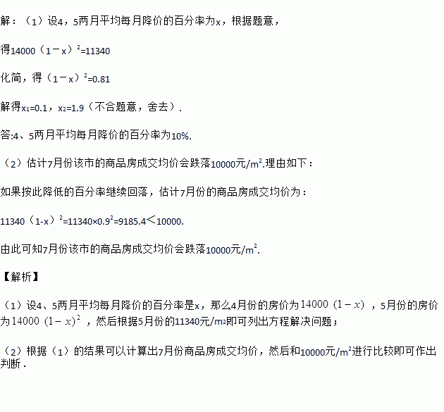 (2)如果房价继续回落,按此降价的百分率,你预测到7月分该市的商品房成交均价是否会跌破3000元/m2?请说明理由.