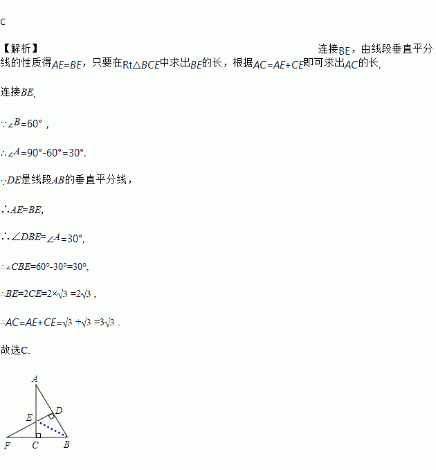 如图,在Rt△ABC中,ACB=90°,B=60°,AB的垂直平分线DE交BC的延长线于点F,若EC=,则AC的长为( )