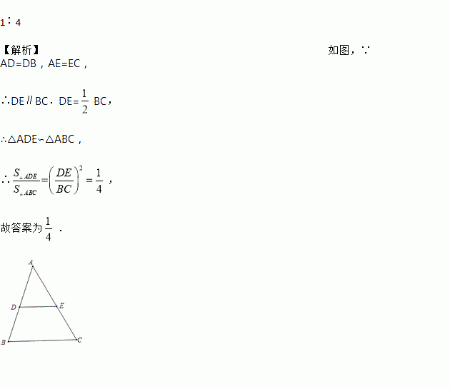 在△ABC中,点D、E分别是边AB、AC的中点,那么△ADE的面积与△ABC的面积的比是______.
