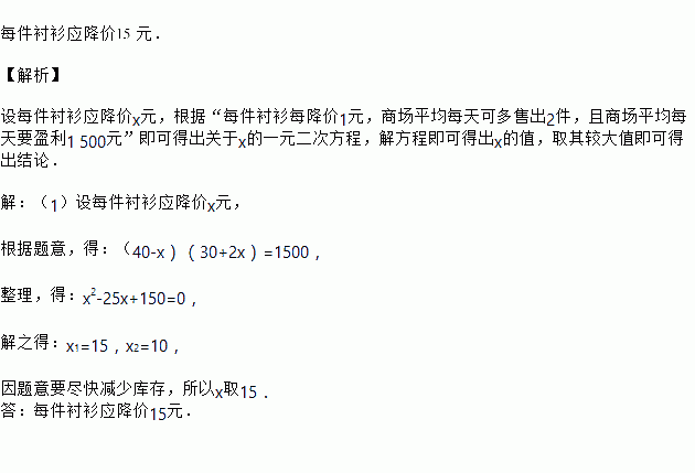 元,为了扩大销售,增加盈利,尽快减少库存,商场决定采取适当的降价措施.经调查发现,如果每件衬衫每降价![]()