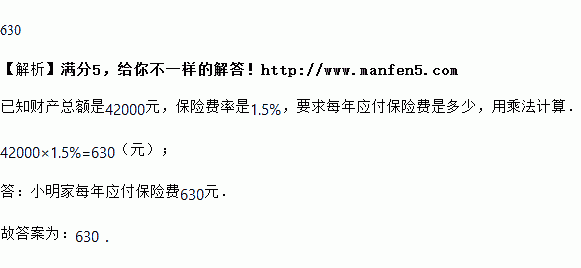 小明家参加保险公司的财产保险.参加保险的财产总额是42000元,如果每年的保险费率是1.5%,小明家每年应付保险费________元.