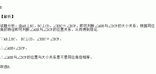 如图,AB⊥BC,BC⊥CD,∠EBC=∠BCF,那么,∠ABE与∠DCF的位置与大小关系是 ( )