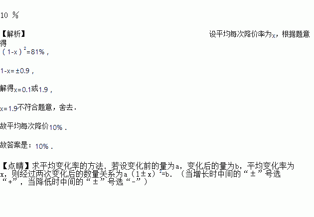 某种商品售价经过两次降价后,新售价为原售价的81%,则平均每次降 ______________________________%