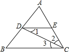点评:根据平行线的性质得到∠AED=∠2+∠3=80°,∠1=∠3,根据CD平分∠ACB,得到∠2=∠3,即可解答.