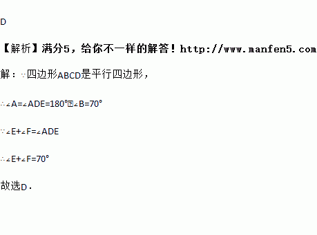 如图,在□ABCD中,∠B=110°,延长AD至点F,延长CD至点E,连结EF,则∠E+∠F=( )