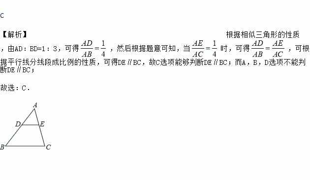 在△ABC中,点D、E分别在AB、AC上,如果AD:BD=1:3,那么下列条件中能够判断DE∥BC的是( )