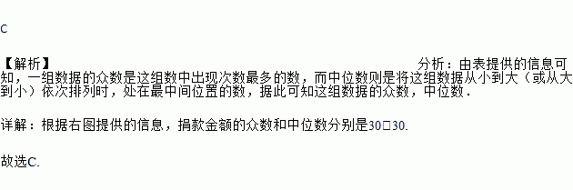 世界因爱而美好,在今年我校举行的“献爱心”捐款活动中,九年级三班50名学生积极参加捐款活动,班长将捐款情况进行了统计,并绘制成了统计图,根据图中提供的信息,捐款金额的众数和中位数分别是( )