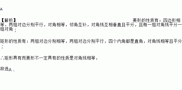 A 【解析】菱形的性质有:四边形相等,两组对边分别平行,对角相等,邻角互补,对角线互相垂直且平分,且每一组对角线平分一组对角; 矩形的性质有:两组对边分别相等,两组对边分别平行,四个内角都是直角,对角线相等且平分; ∴矩形具有而菱形不一定具有的性质是对角线相等, 故选A.