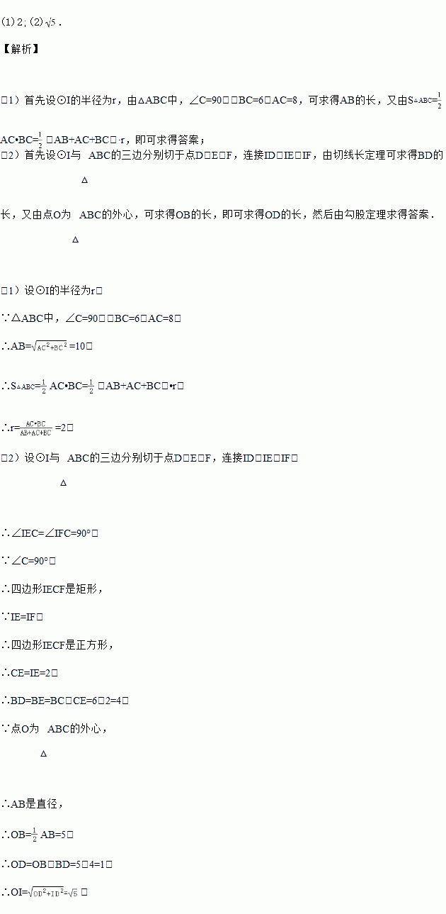 如图,△ABC中,∠C=90°,⊙I为△ABC的内切圆,点O为△ABC的外心,BC=6,AC=8.