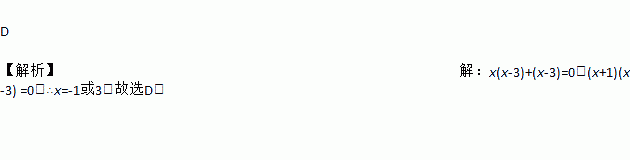 D 【解析】【解析】 x(x-3)+(x-3)=0,(x+1)(x-3) =0,∴x=-1或3.故选D.