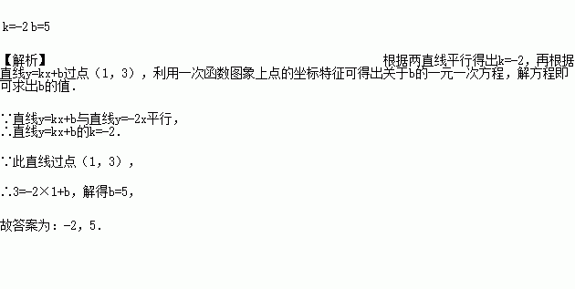 若直线y=kx+b与直线y=-2x平行,且过点(1,3),则k=__________, b=___________;