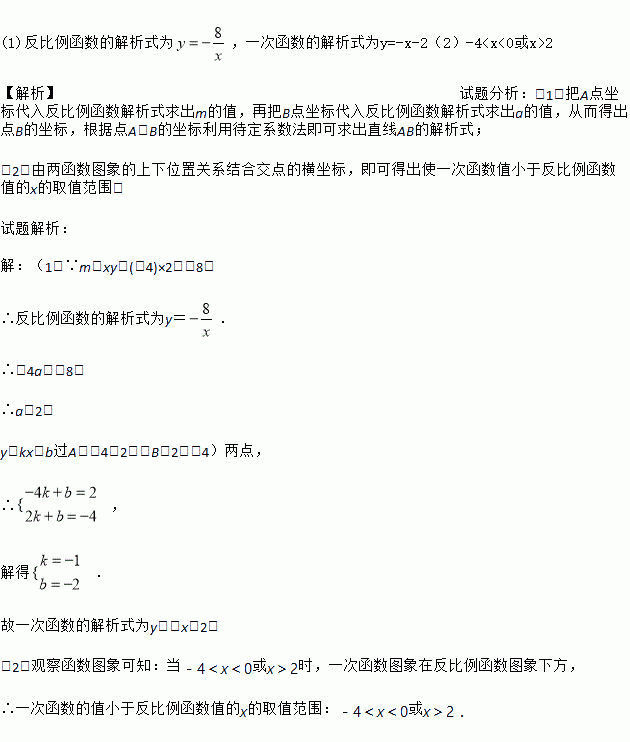 (1)反比例函数的解析式为,一次函数的解析式为y=-x-2(2)-4