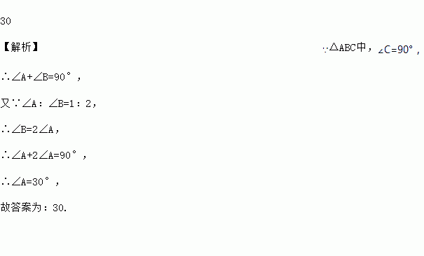 △ABC中,∠C=90°,∠A∶∠B=1∶2,则∠A=___度.