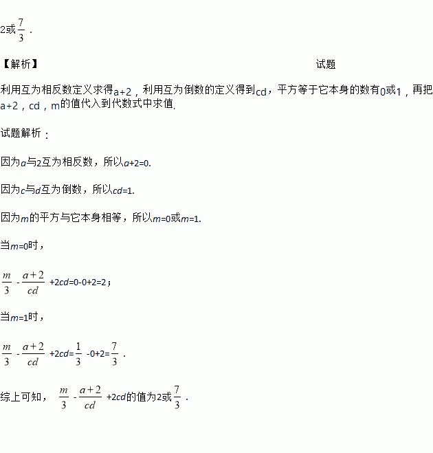 若a与2互为相反数,c与d互为倒数,m的平方与它本身相等,请你求-+2cd的值.