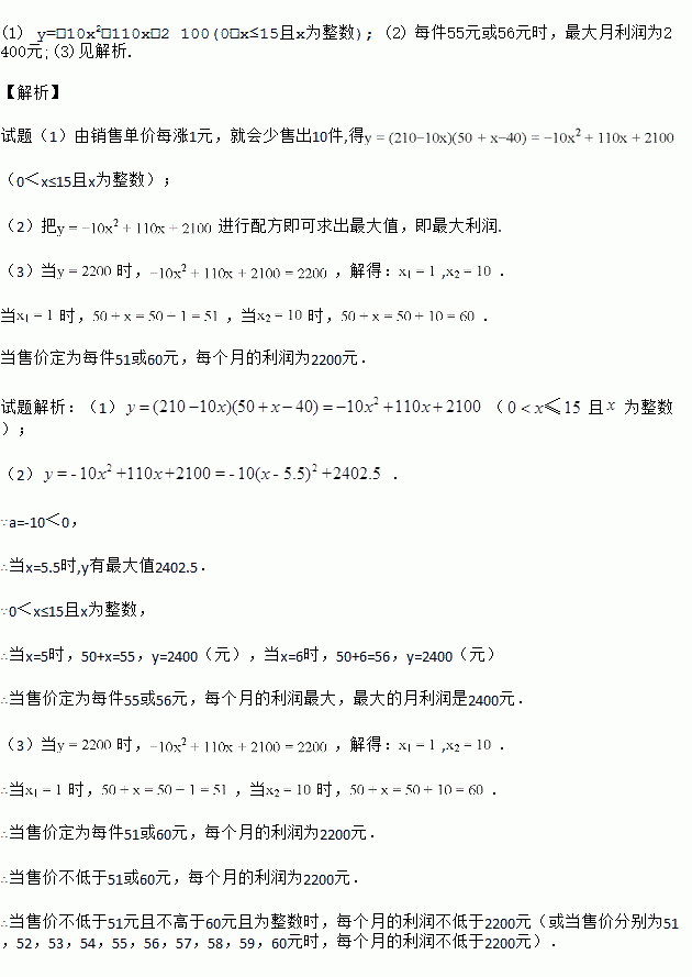(3)每件商品的售价定为多少元时,每个月的利润恰为2200元?根据以上结论,请你直接写出售价在什么范围时,每个月的利润不低于2200元?