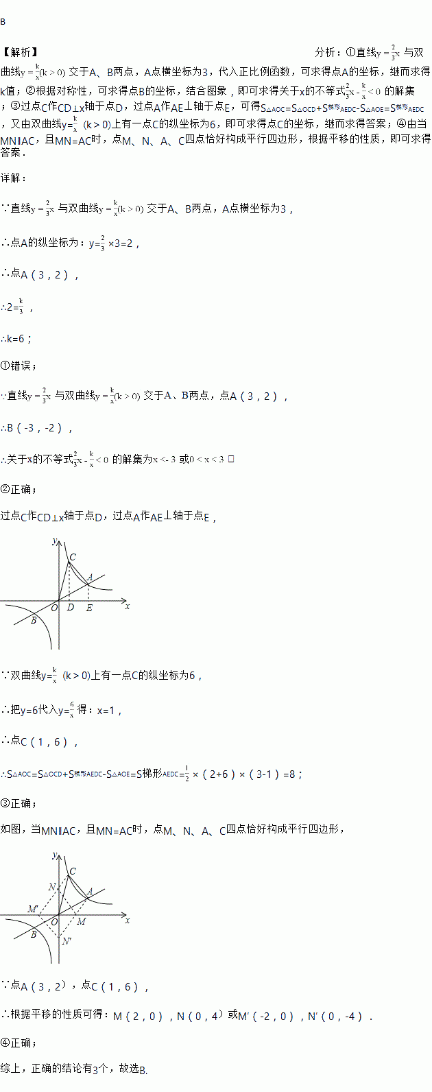 交于A、B两点,A点的横坐标为3,则下列结论:①k=3;②关于x的不等式