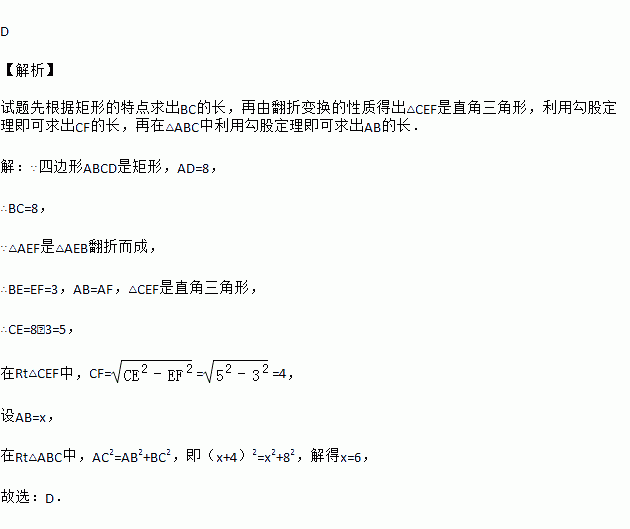 如图,矩形纸片ABCD中,已知AD =8,折叠纸片使AB边与对角线AC