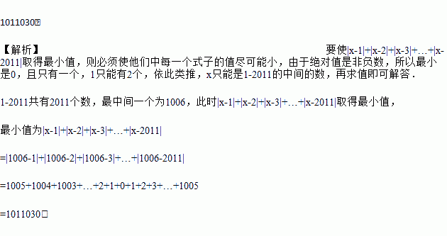 问当x取何值时,|x﹣1|+|x﹣2|+|x﹣3|+…+|x﹣2011|取得最小值,并求出最小值.