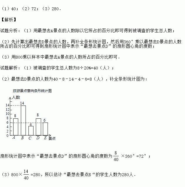 (1)40;(2)72;(3)280. 【解析】 试题分析:(1)用最想去A景点的人数除以它所占的百分比即可得到被调查的学生总人数; (2)先计算出最想去D景点的人数,再补全条形统计图,然后用360°乘以最想去D景点的人数所占的百分比即可得到扇形统计图中表示“最想去景点D”的扇形圆心角的度数; (3)用800乘以样本中最想去A景点的人数所占的百分比即可. 试题解析:(...
