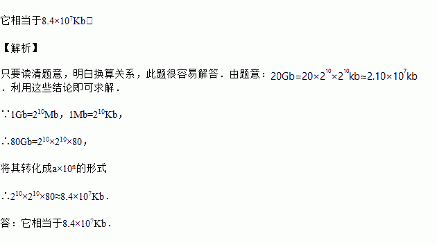 计算机存储容量的基本单位是字节,用b表示,计算机中一般用Kb(千字节)或Mb(兆字节)或Gb(吉字节)作为存储容量的计算单位,它们之间的关系为1Kb=210b,1Mb=210Kb,1Gb=210Mb.一种新款电脑的硬盘存储容量为80Gb,它相当于多少Kb?(结果用科学记数法表示,精确到百万位)