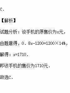 某品牌手机的进价为1200元,按原价的八折出售可获利14%,则该手机的原售价为( )