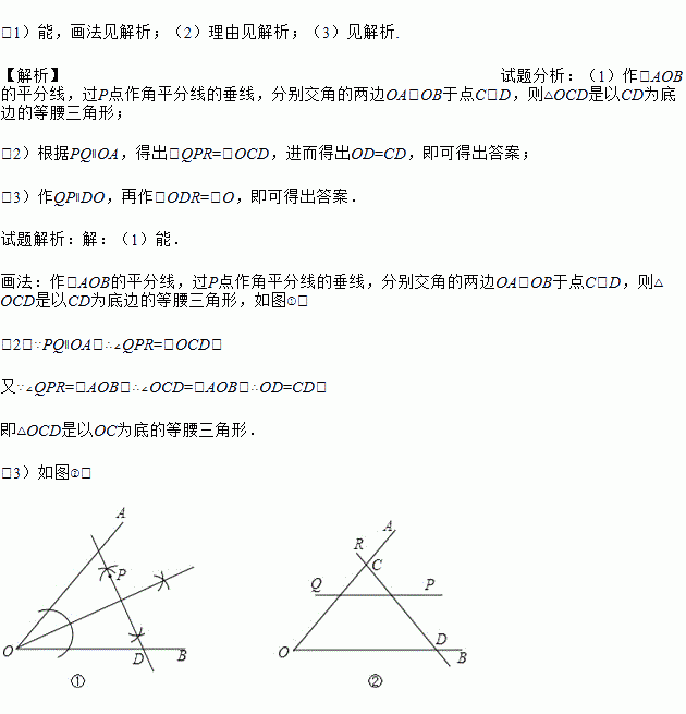 (2)若点P不在∠AOB的平分线上(如图③),我们可以过P点作PQ∥OA,并作∠QPR=∠AOB,直线PR分别交OA、OB于点C、D,则可以得到△OCD是以OC为底的等腰三角形.请你说明这样作的理由.