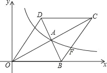 如图,在平面直角坐标系中,菱形OBCD的边OB在x轴上,反比例函数y=(x>0)的图象经过菱形对角线的交点A,且与边BC交于点F,点A的坐标为(4,2).