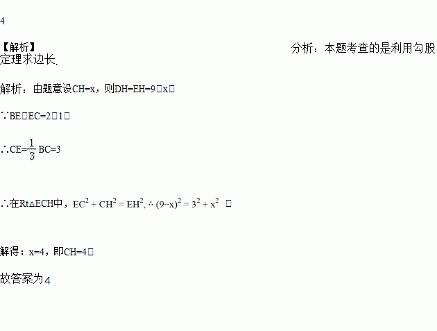 如图,正方形ABCD的边长为9,将正方形折叠,使顶点D落在BC边上的点E处,折痕为GH, 若BE∶EC=2∶1,则线段CH的长是_________