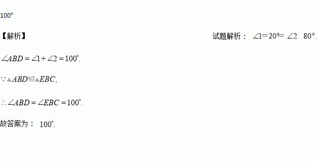 如图,△ABD≌△EBC,∠1=20°,∠2=80°,则∠EBC的度数为________