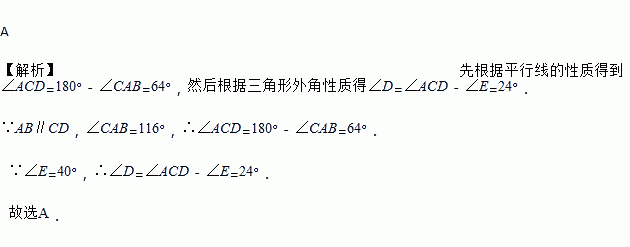 如图所示,AB∥CD,∠CAB=116°,∠E=40°,则∠D的度数是( )