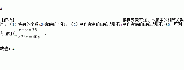 用白铁皮做罐头盒,每张铁皮可制盒身25个,或制盒底40个,一个盒身与两个盒底配成一套罐头盒.现有36张白铁皮,设用x张制盒身,y张制盒底,可以使盒身与盒底正好配套则根据题意,列方程组正确的是( )