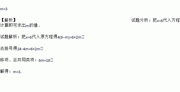 m=3 【解析】试题分析:把x=6代入方程计算即可求出m的值. 试题解析:把x=6代入原方程得4(6?m)=6+2m, 去括号得24?4m=6+2m, 移项、合并同类项:6m=18, 解得:m=3.