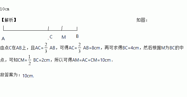 已知线段AB=12cm,点C在线段AB上,且AC=AB,M为BC的中点,则AM的长为________.