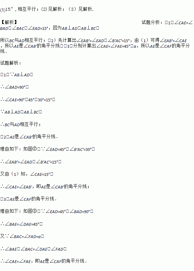 (2)在(1)的基础上,再拿一个30°,60°,90°的直角三角板,如图②放置,将AC′边和AD边重合, AE是∠CAB′的角平分线吗,如果是,请加以说明,如果不是,请说明理由.