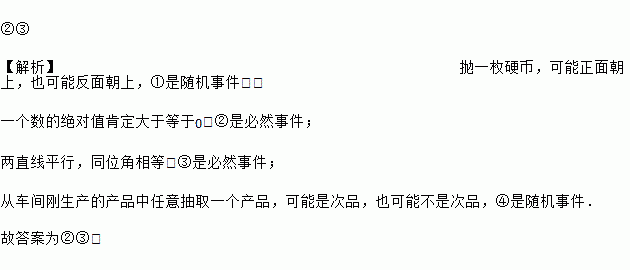 ②③ 【解析】抛一枚硬币,可能正面朝上,也可能反面朝上,①是随机事件,; 一个数的绝对值肯定大于等于0,②是必然事件; 两直线平行,同位角相等,③是必然事件; 从车间刚生产的产品中任意抽取一个产品,可能是次品,也可能不是次品,④是随机事件. 故答案为②③.