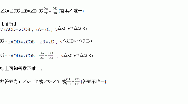 如图,AB、CD相交于点O,试添加一个条件使得△AOD∽△COB,你添加的条件是________.(只需写一个)