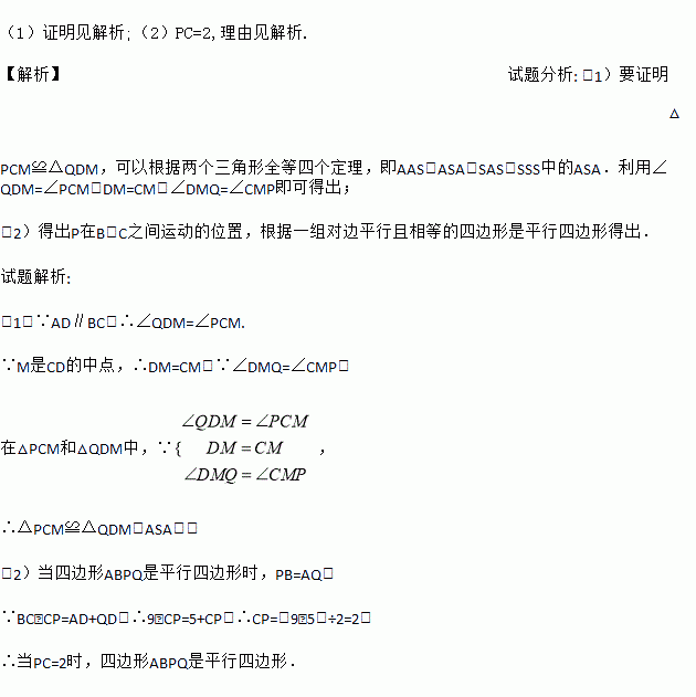 如图,在四边形ABCD中,AD∥BC,AD=5cm,BC=9cm.M是CD的中点,P是BC边上的一动点(P与B,C不重合),连接PM并延长交AD的延长线于Q.