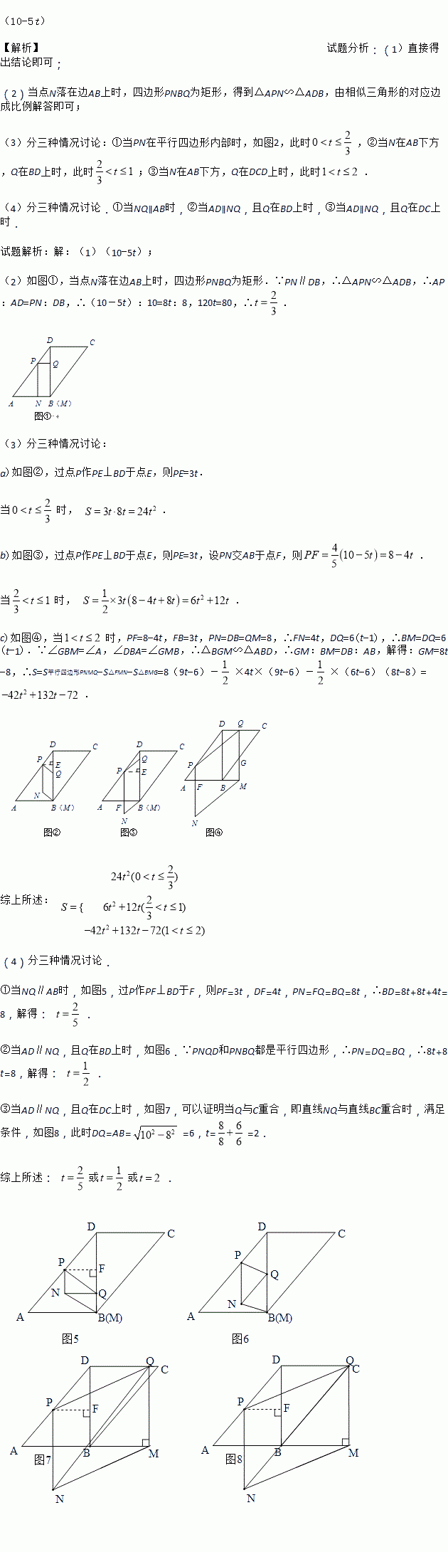 Èçͼ£¬BDÊÇ¡õABCDµÄ¶Ô½ÇÏߣ¬AB¡ÍBD£¬BD=8cm£¬AD=10cm£¬¶¯µãP´ÓµãD³ö·¢£¬ÒÔ5cm/sµÄËÙ¶ÈÑØDAÔ˶¯µ½ÖÕµãA£¬Í¬Ê±¶¯µãQ´ÓµãB³ö·¢£¬ÑØÕÛÏßBD¡ªDCÔ˶¯µ½ÖÕµãC£¬ÔÚBD¡¢DCÉÏ·Ö±ðÒÔ8cm/s¡¢6cm/sµÄËÙ¶ÈÔ˶¯.¹ýµãQ×÷QM¡ÍAB£¬½»ÉäÏßABÓÚµãM£¬Á¬½ÓPQ£¬ÒÔPQÓëQMΪ±ß×÷¡õPQMN.ÉèµãPµÄÔ˶¯Ê±¼äΪt(s)£¨t>0£©£¬¡õPQMNÓë¡õABCDÖØµþ²¿·ÖͼÐεÄÃæ»ýΪS£¨cm2£©.